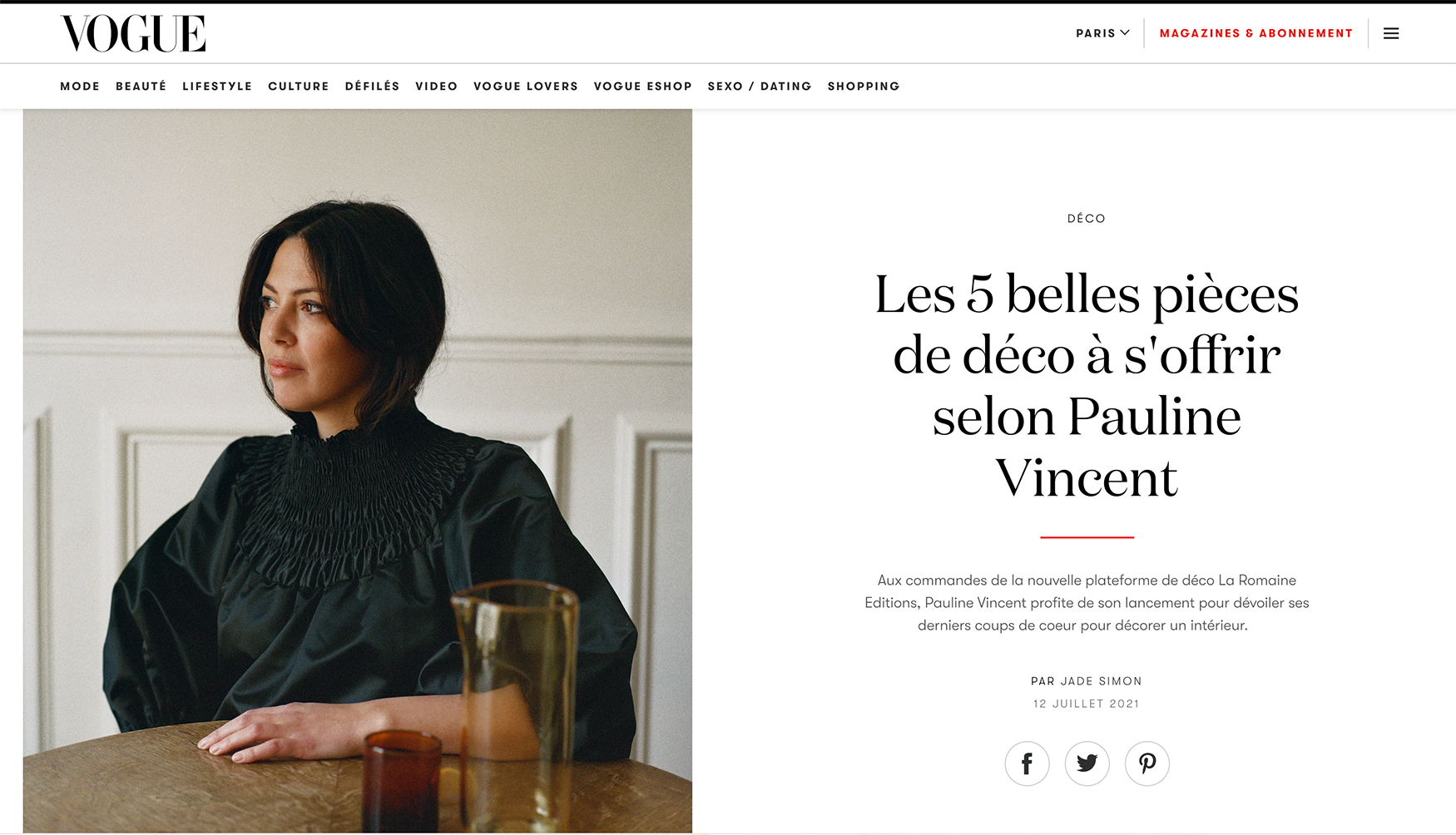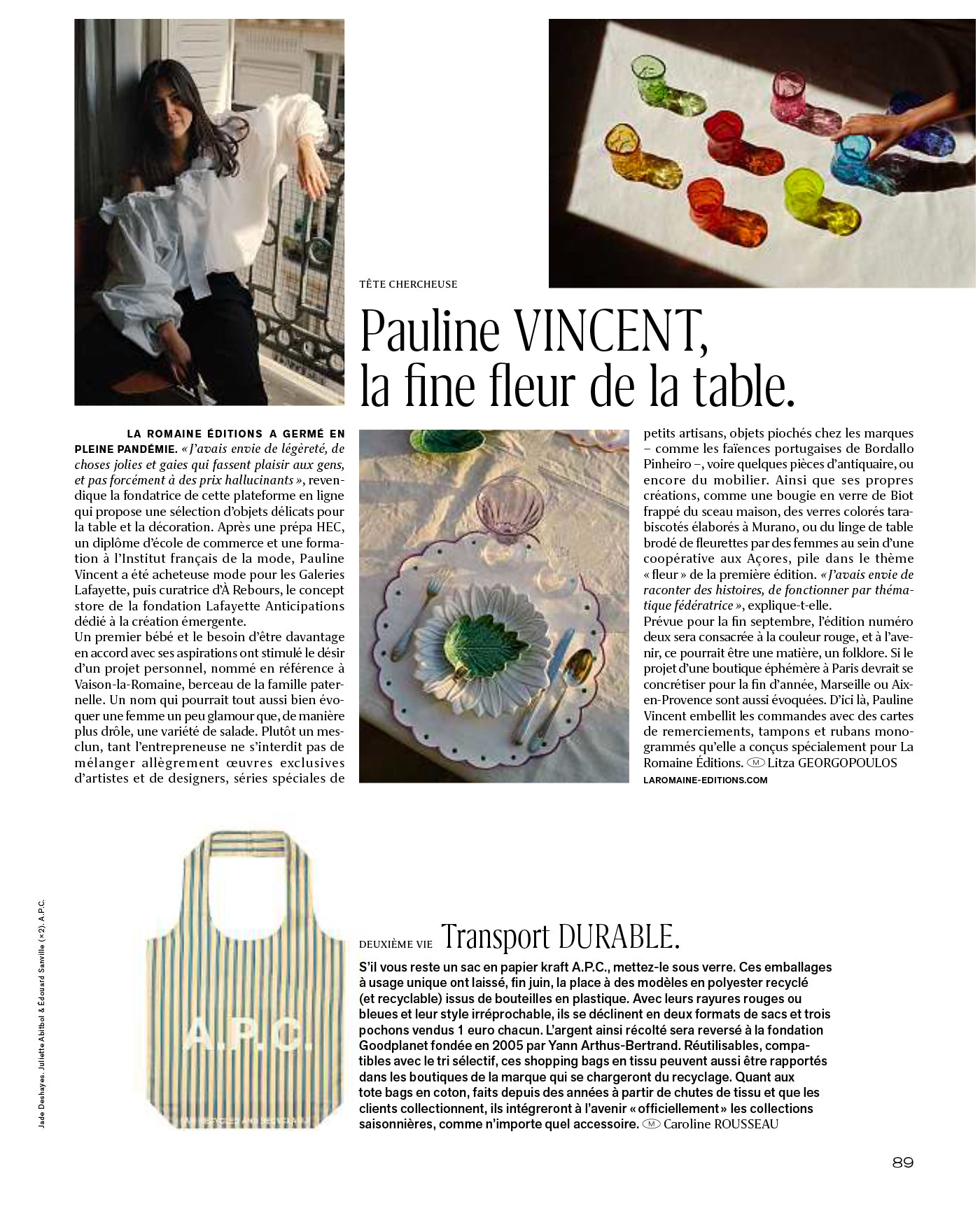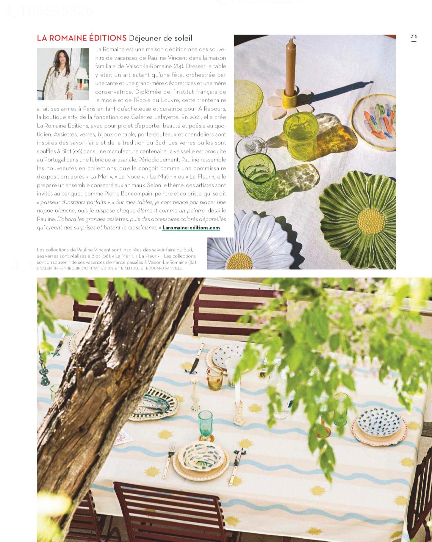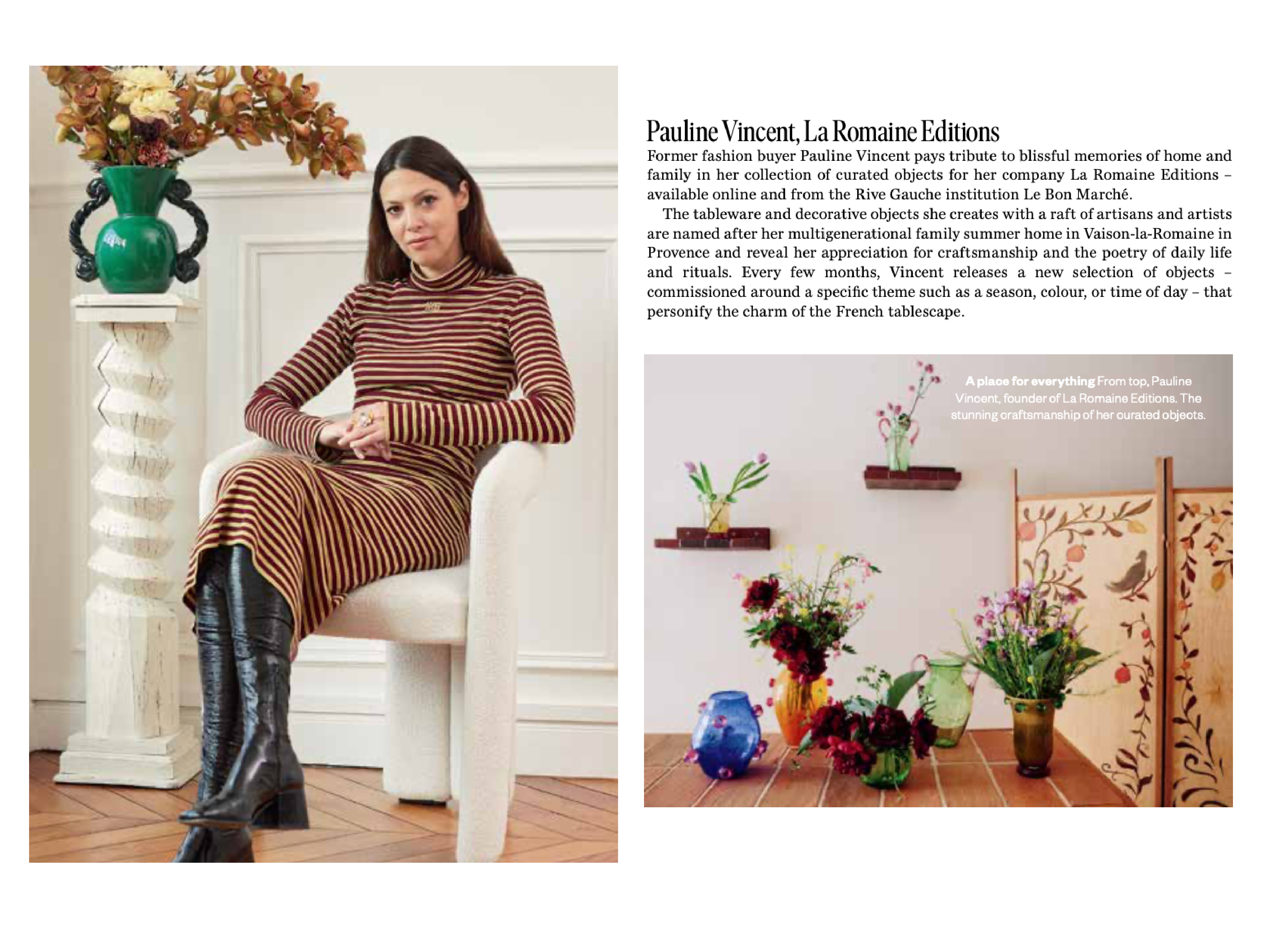 Fondée par Pauline Vincent, La Romaine Editions est la continuité d'une recherche de beauté simple et spontanée dans la vie de tous les jours. Depuis toujours entourée d’objets, elle aime se souvenir des décors de son enfance, des ateliers d’artisans avec sa tante et sa grand-mère décoratrices, des musées avec sa mère conservatrice. Elle a longtemps observé les formes et les couleurs, développé son goût pour le talent des uns et le savoir-faire des autres.
